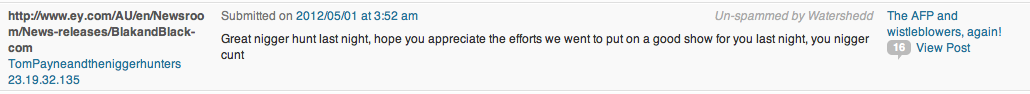 In reviewing the comments on the blog, Blak and Black has again found a missive from the Australian KKK, again operating as a pingback. However, in this case the commenter has got the user ID and the HTML link back to front. Hence the user ID tries to load as the website (i.e. the URL that tries to load is http://tompayneandtheniggerhunters/), rather than linking to the actual Ernst & Young website. The URL for the website has become the user ID and just happens to be none other than the statement from Ernst & Young regarding the original abusive Tom Payne comment. We can only take this as Ernst & Young giving Blak and Black the finger and giving weight to argument within the body of the post regarding the research by Piff et al that individuals from wealthier backgrounds see themselves as above the law. In the case of Ernst & Young, and we can only assume from the evidence at our disposal that they pingbacks come from Ernst & Young, that they are saying to Bakchos that we can destroy your property at will, we can make death threats against you, we can racially vilify you and send four gutless thugs around to put a pillowcase on your head, a noose around your neck, pour petrol over you and remain completely immune to Australian and United States law.
