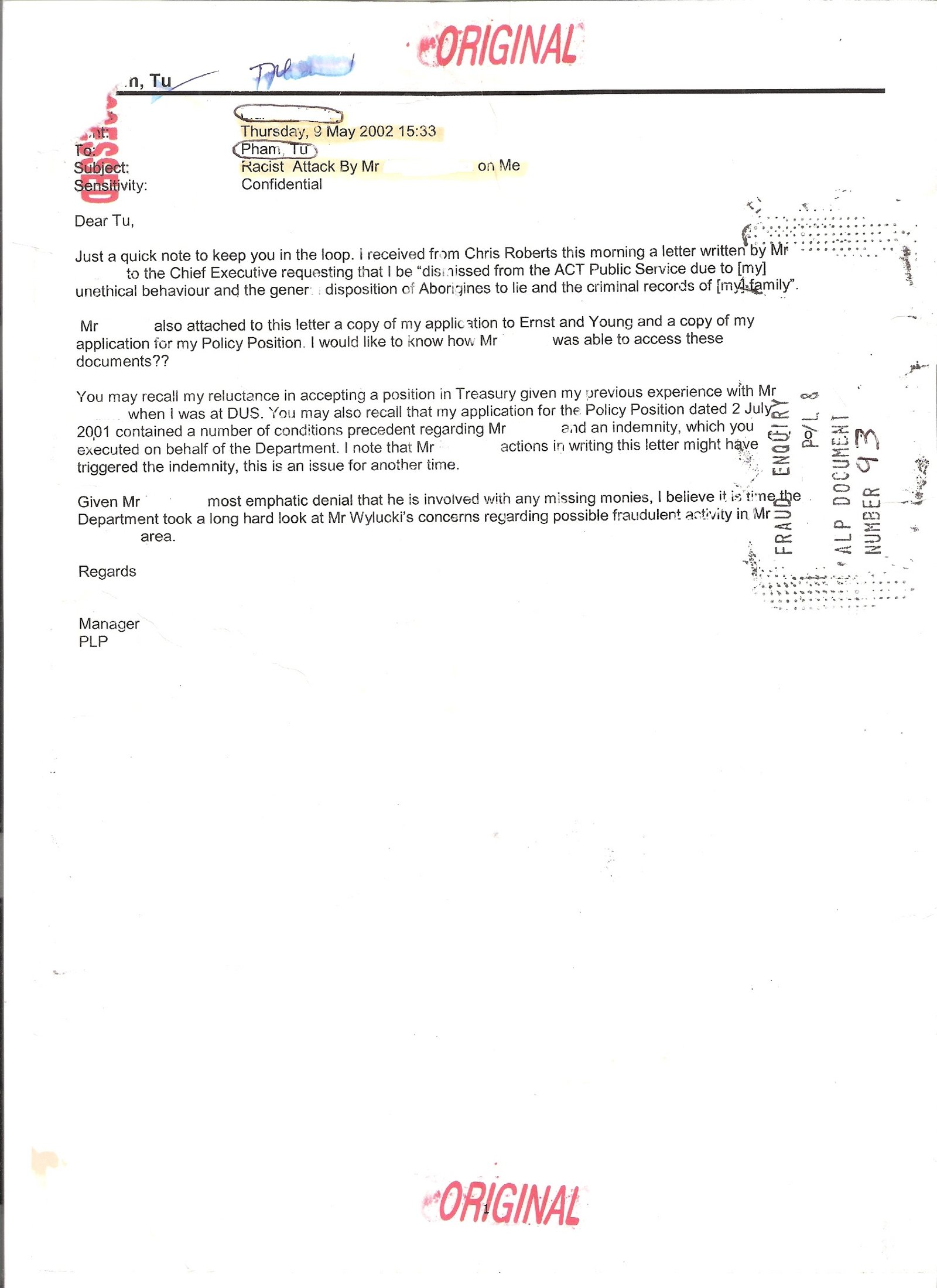 The blatantly racist and denigrating tone of this letter should have been enough for disciplinary action to be taken against the writer, but that was not to be so. Having encountered problems with the Inquisitor in the past, Pat had effected what he believed to be an agreement between himself and senior management to prevent being victimized again. He referenced this in an email to Tu Pham, then ACT Deputy Chief Executive Department of Treasury and Pat’s direct supervisor: