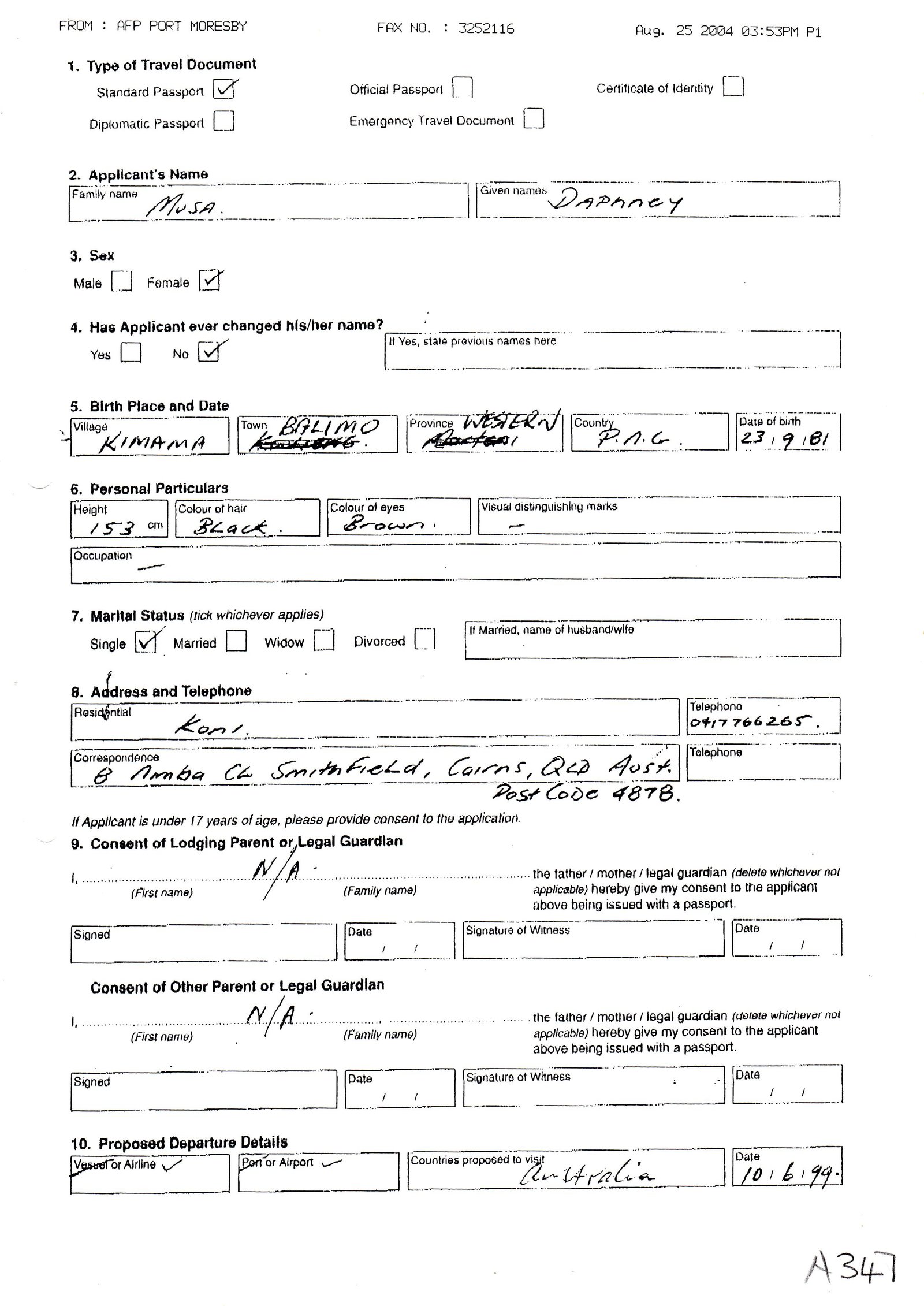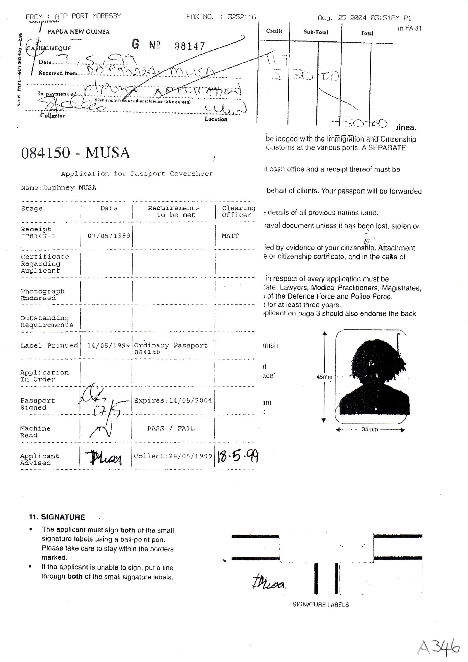 On 14 May 1999 Ms Musa was issued with a Papua New Guinea (“PNG”) passport bearing the serial number 084150. This passport had an expiry date of 14 May, 2004. This document shows Ms Musa’s birth date as being 23 September, 1981. The documents relating to Ms Musa’s May, 1999 passport application were faxed from the AFP Port Moresby offices via fax number 325 2116 on August 25, 2004. This was the day after Captain Martens was arrested and charged with child sex tourism offences relating to Ms Musa by AFP officer Tania Stokes in Port Moresby.