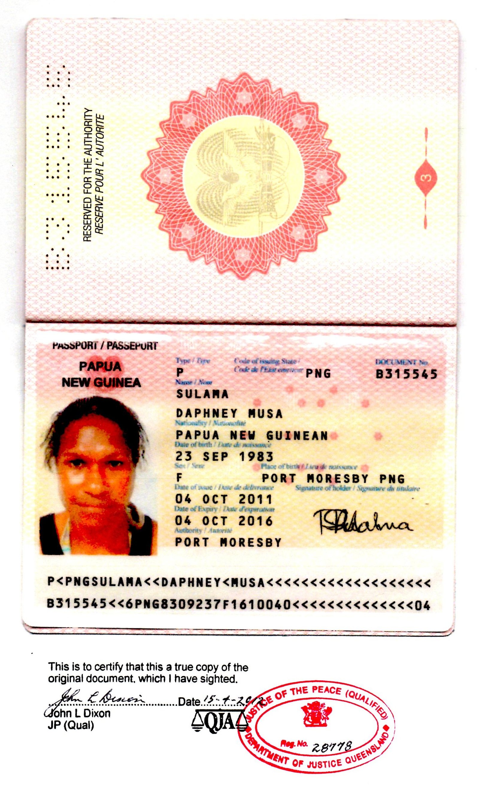 On 4 October, 2011 Ms Musa now known as Daphney Sulama was issued with a new PNG passport with a document number of B315545 and showing her birth date as 23 September, 1983.