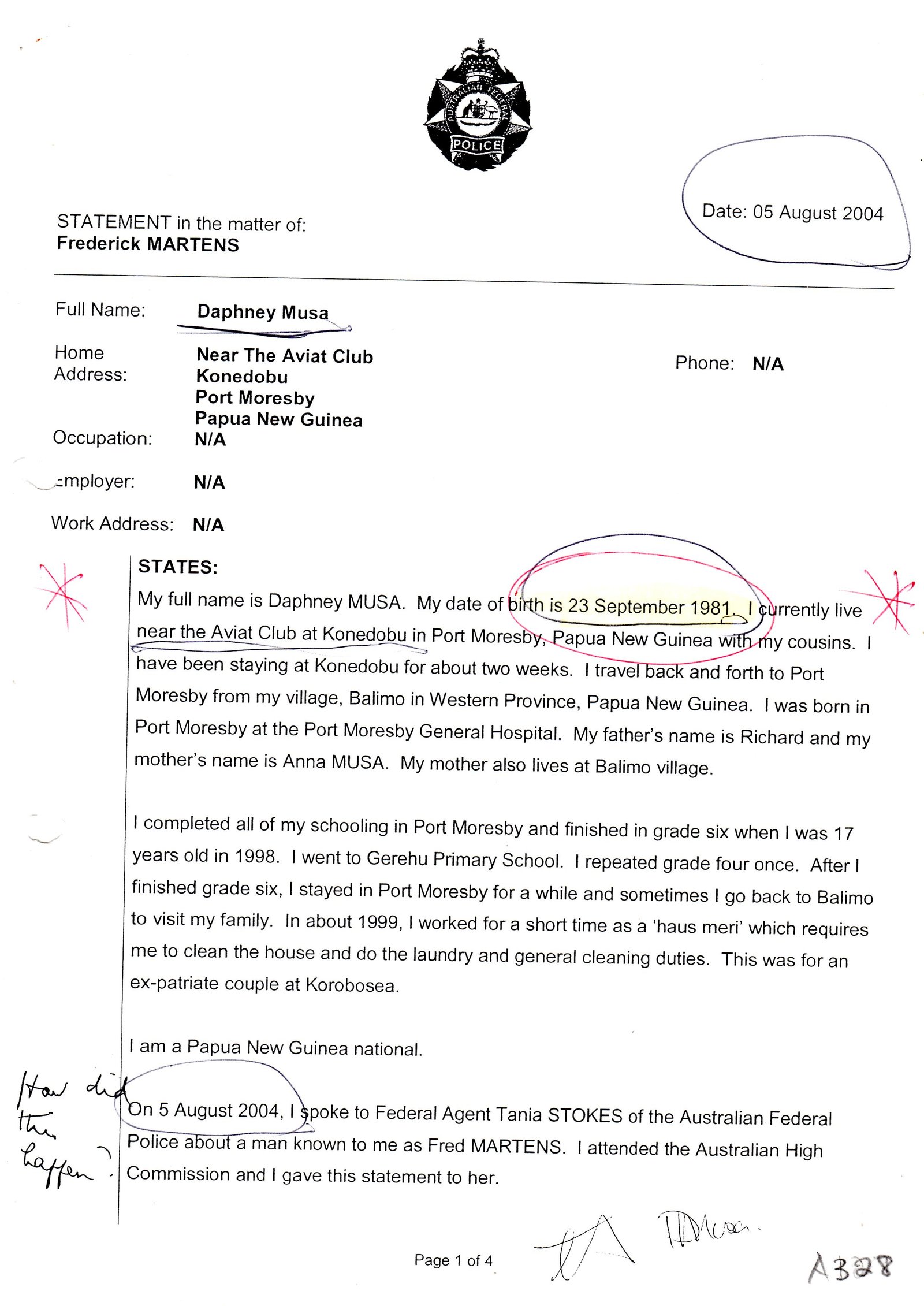 Following Captain Martens arrest, Ms Musa confirmed her year of birth as being 1981 in a number of Statements she gave to the AFP. On 5 August 2004, Ms Musa gave a statement to AFP officer 10695 Tania Stokes in which she stated: