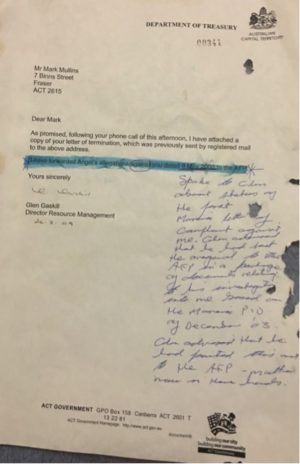 Letter Kosmidis to Mullins following his resignation from the ACT Dept of Urban Services. Page 1 of 2.