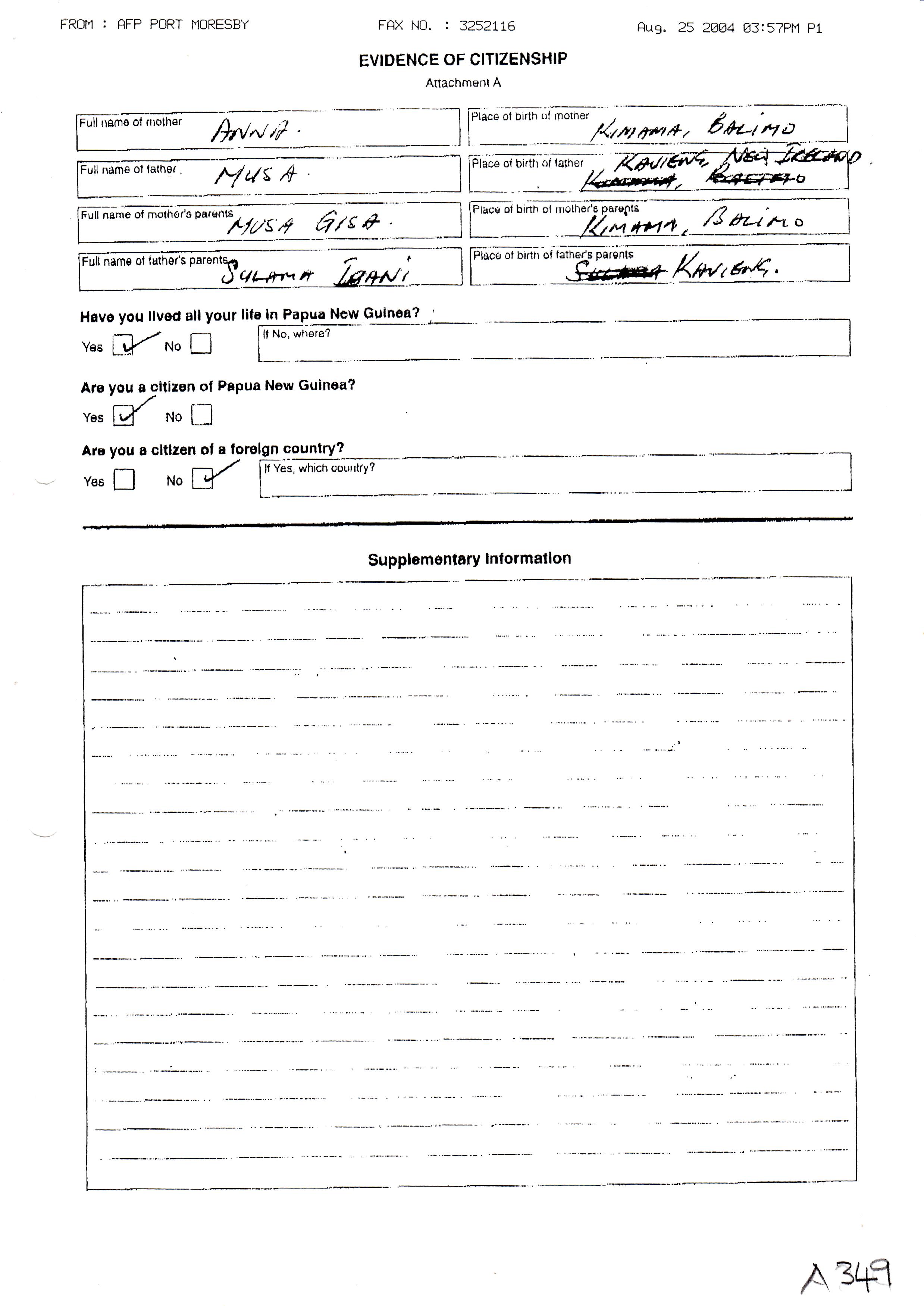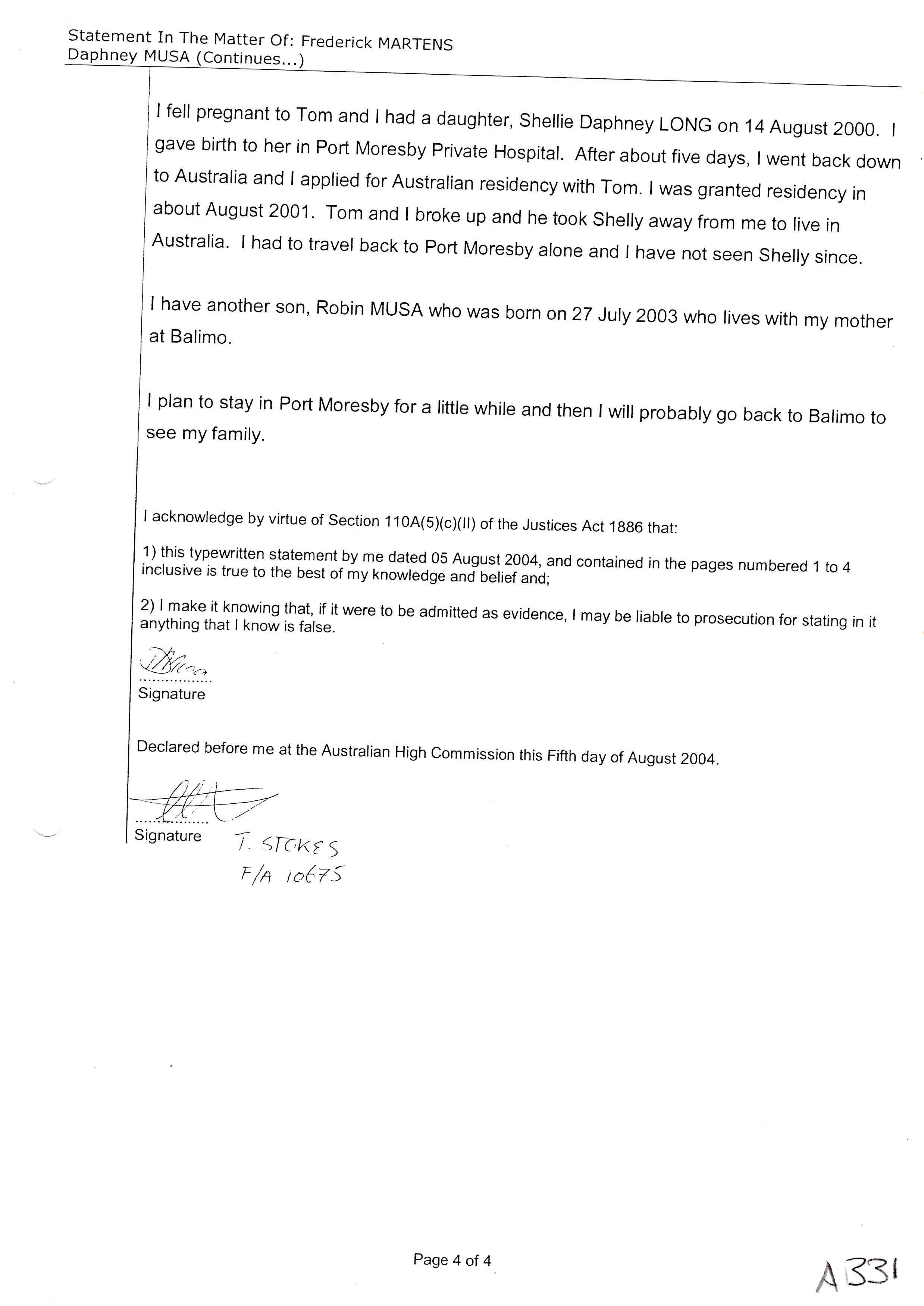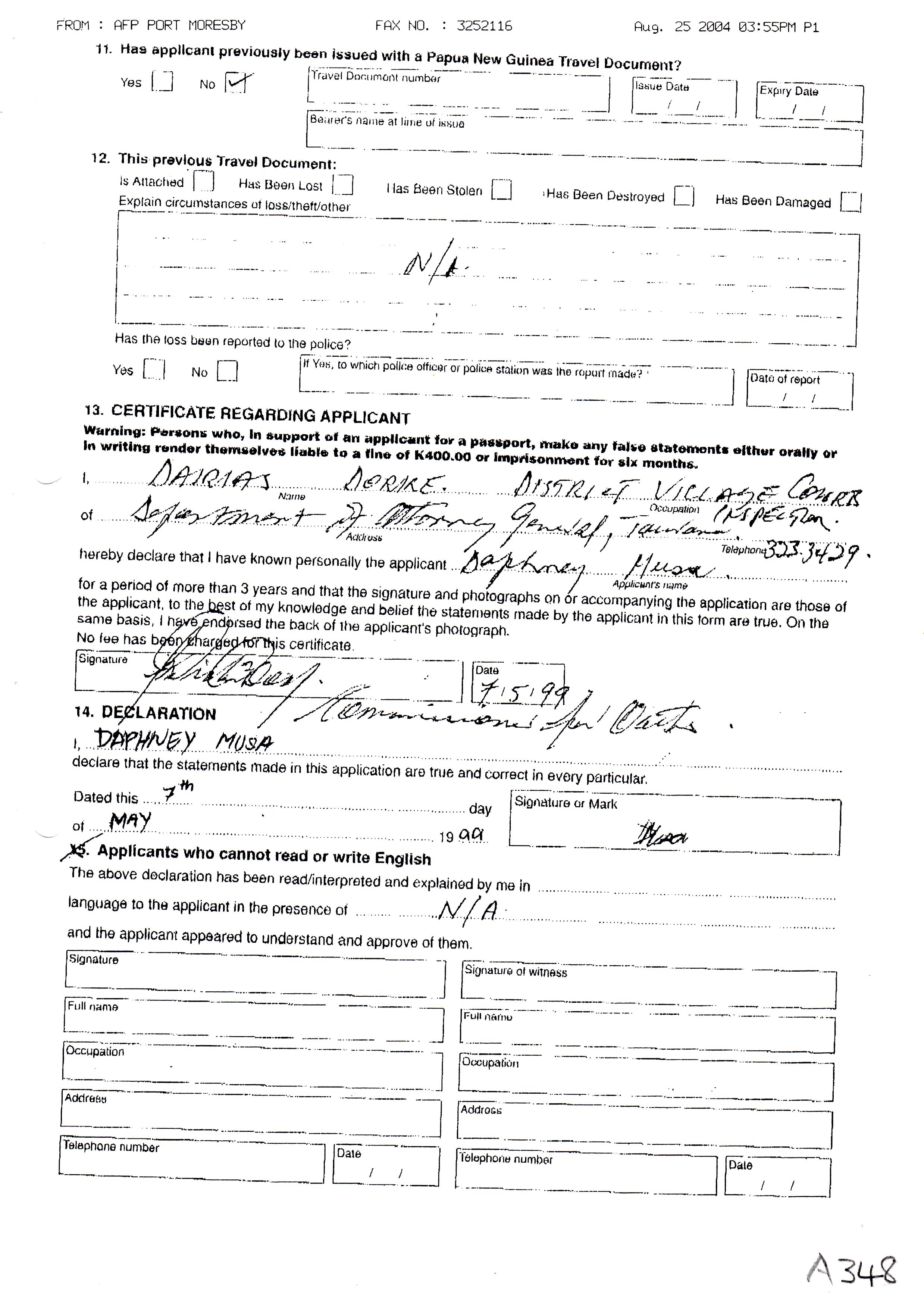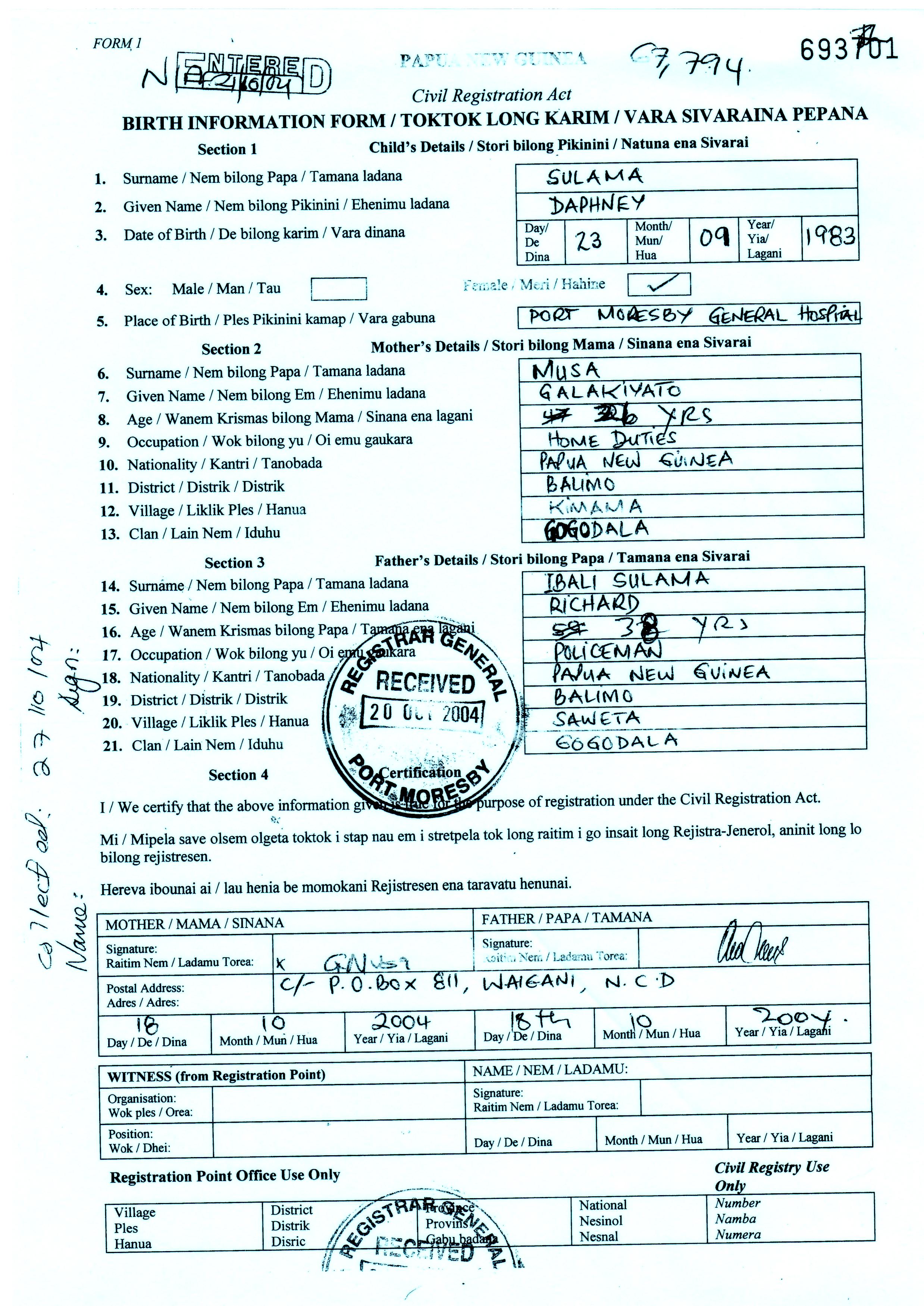 Daphne Sulama’s (aka Daphne Musa) PNG Passport Application pages 1 through 4 inclusive.